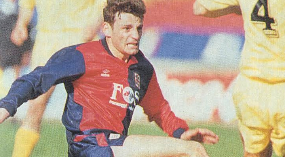 «Lo sponsor tecnico “Umbro” con lo sponsor commerciale “Fos” restringono di molto, il campo d’azione. La stagione può essere la 1990-91 o la 1991-92, perché sono solo queste le due stagione dove i rossoblù isolani si sono avvalsi di entrambi gli sponsor. Sfogliando il Panini l’unico giocatore che assomiglia a quello della foto è il difensore Carlo Cornacchia che, nelle due stagioni “incriminate”, giocò solo la stagione 1990-91»),