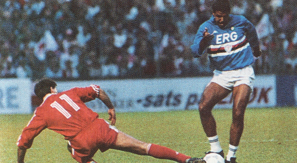 «Si riconoscono in primo piano il brasiliano blucerchiato Toninho Cerezo e di spalle l’attaccante norvegese Einar Roth»),