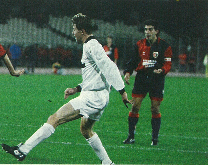 «Siamo nel ritorno degli ottavi di finale di Uefa ed il Cagliari ha già ipotecato il passaggio del turno grazie al clamoroso 1-3 in Belgio, primo successo esterno europeo nella storia dei sardi. Nonostante Giorgi si ritrovi a schierare un’unica punta, Oliveira, non al meglio fisicamente, la gara si mette subito bene grazie al colpo di testa di Firicano al 14′. Lo stesso “Lulù” è costretto ad uscire poco dopo la mezz’ora ma contro un Malines ormai decadente e lontano da quello che ben figurò in Europa a fine anni ’80, può bastare anche il buon Criniti»),