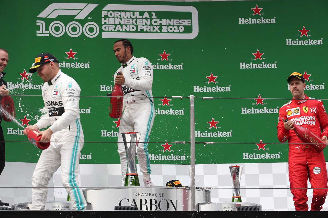 Lewis Hamilton domina il Gp della Cina davanti al compagno di squadra Bottas assicurando nel giorno del 1000° Gp nella storia della Formula 1 la terza doppietta consecutiva da inizio stagione. Ferrari sul podio con Vettel.