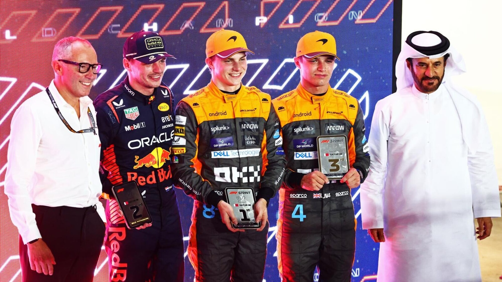 Una gara speciale. La Sprint del Gp del Qatar passerà alla storia per esser stata la prima gara Sprint ad aver assegnato il titolo mondiale, in virtù del secondo posto finale di Max Verstappen (Red Bull) e del contemporaneo ritiro di Sergio Perez, al termine di una corsa che ha evidenziato l’ottimo feeling della McLaren sul circuito di Lusail (come dimostra la vittoria di Oscar Piastri e il terzo posto di Lando Norris), ma anche la grande intelligenza tecnico-tattica del neo tre volte campione del mondo olandese. Resosi conto che difficilmente avrebbe potuto lottare per la vittoria della Sprint con Piastri, Verstappen ha preferito portare a casa la certezza del titolo piloti, non esitando comunque a far registrare il giro più veloce (1’25”604 nel corso del 17°giro), in attesa nella gara domenicale di poter festeggiare il titolo iridato appena conquistato con una vittoria (decisamente alla sua portata, visto che Max partirà dalla pole position, mentre Piastri e Norris partiranno rispettivamente dal sesto e dal decimo posto in griglia).