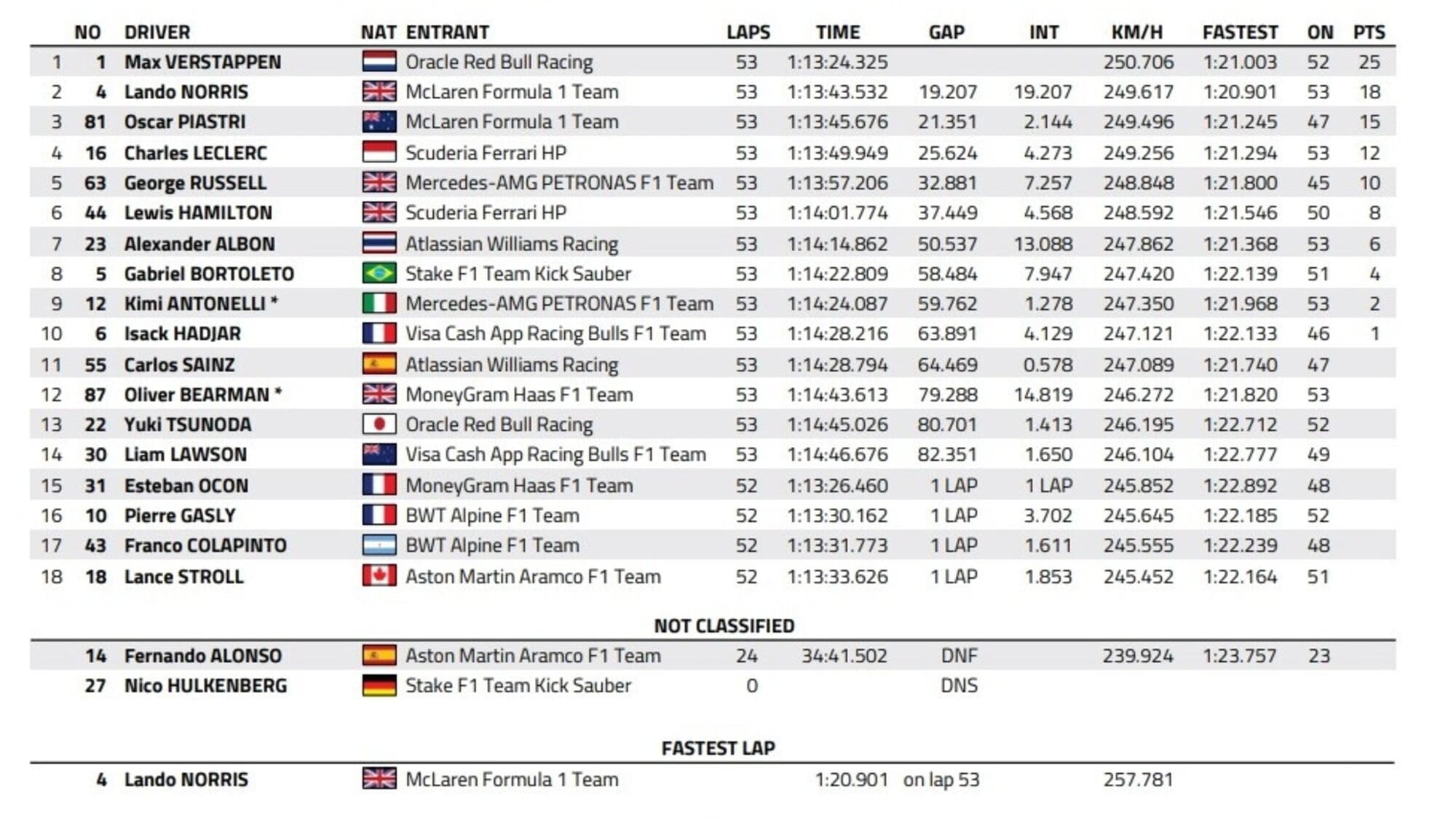In Classifica Piloti Oscar Piastri resta in testa con 324 punti, con il compagno di squadra Lando Norris (secondo) a quota 293. In terza posizione troviamo Max Verstappen con 230 punti, seguito da Russell (194), Leclerc (163), Hamilton (117), Albon (70), Antonelli (66), Hadjar (38), Hulkenberg (37), Stroll (32), Alonso (30), Ocon (28), Gasly e Lawson (20), Bortoleto (18), Bearman e Sainz (16), Tsunoda (12).