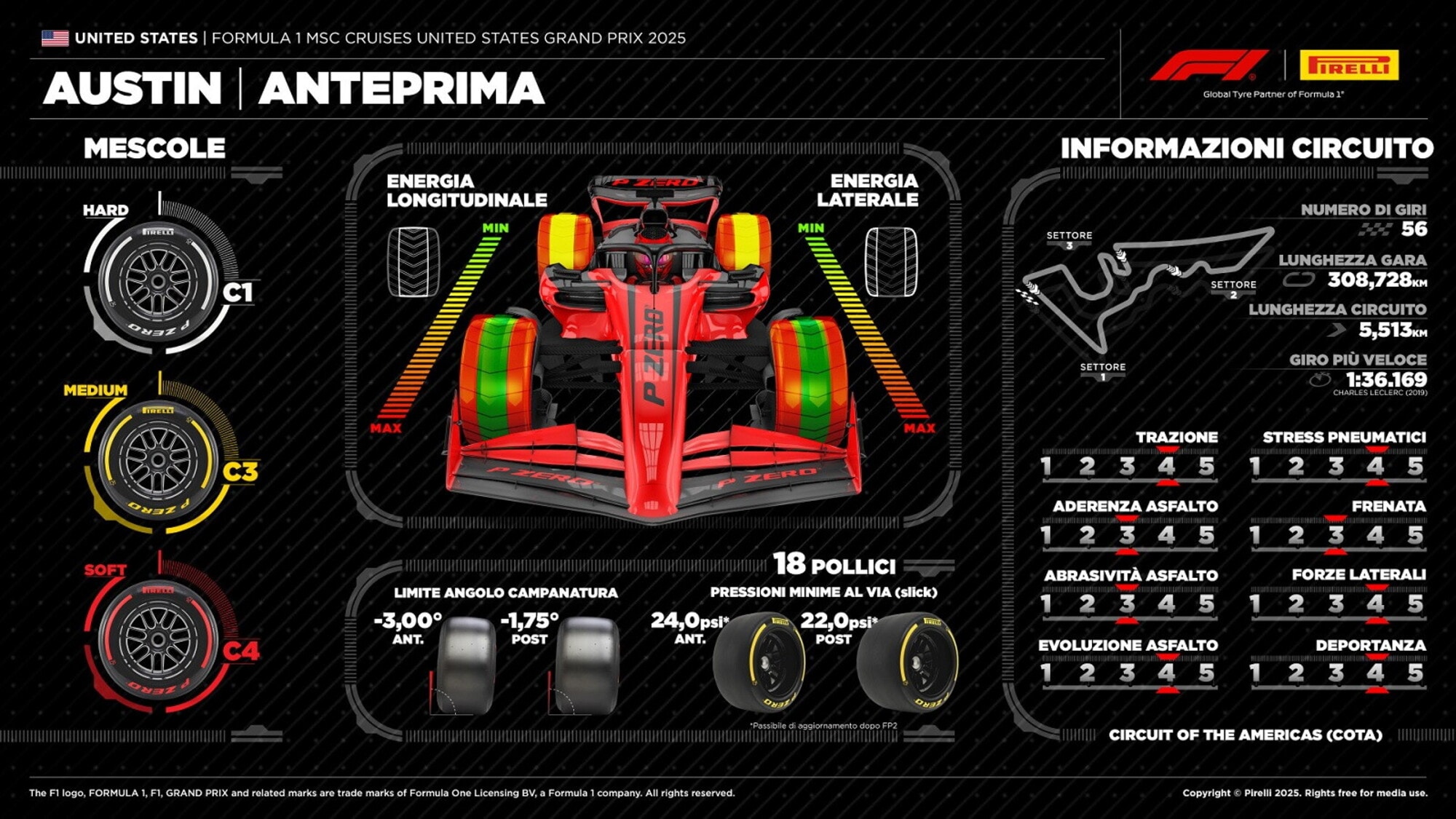Per via della Sprint, cambia l’allocazione delle gomme: ogni pilota avrà pertanto a disposizione 6 set di gomme soft C4, 4 set di gomme medie C3 e 2 set di gomme dure C1.