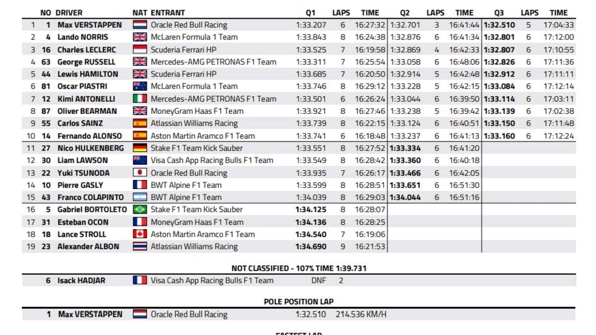 Qualifica da dimenticare infine per la Racing Bulls: se Liam Lawson viene eliminato in Q2 con il dodicesimo tempo, peggio ancora è andata ad Isack Hadjar, a muro in curva 6 nelle primissime fasi del Q1 e che partirà dal fondo dello schieramento.