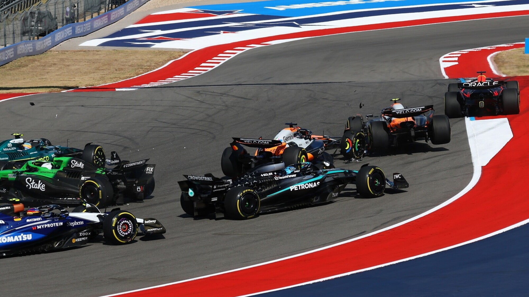 Alla luce dei numerosi detriti disseminati sulla pista di Austin (con l’ala anteriore della Sauber raccolta per un tratto dalla Red Bull di Yuki Tsunoda), la Direzione Gara decide di mandare in pista la Safety Car, la quale tornerà ai box solamente al termine del quinto dei diciannove giri in programma, con Max Verstappen che ha dinanzi a se la possibilità di recuperare ben otto punti nei confronti di Piastri.