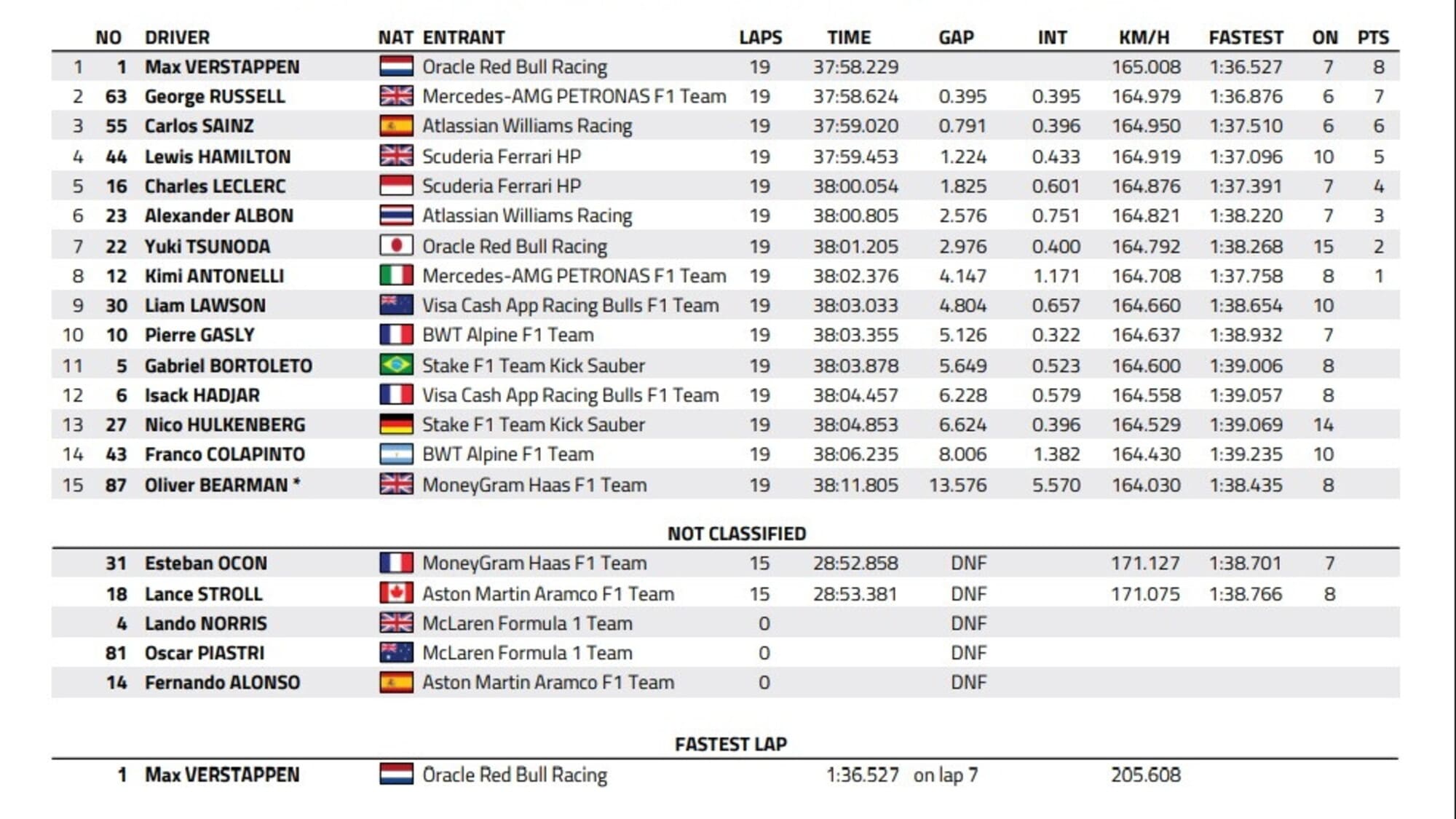 In Classifica Costruttori la McLaren (campione del mondo) è in testa con 650 punti, seguita da Mercedes (333), Ferrari (307), Red Bull (300), Williams (111), Racing Bulls (72), Aston Martin (68), Sauber (55), Haas (46), Alpine (20).