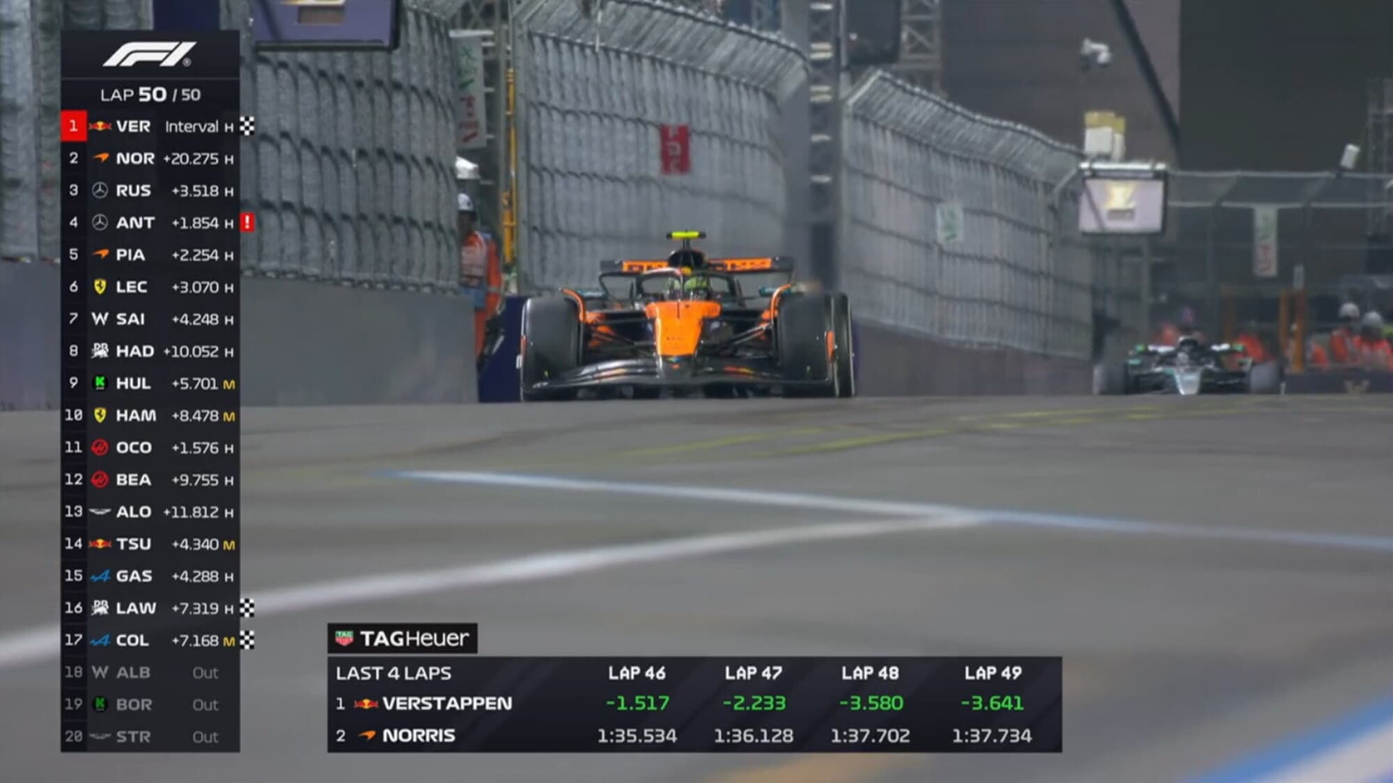 Se infatti fino al 45°giro il distacco accusato nei confronti di Verstappen era quantificabile intorno ai sei secondi, negli ultimi cinque giri Norris ha rallentato al punto da chiudere il Gp di Las Vegas con un ritardo di 20”741 dal campione olandese della Red Bull.