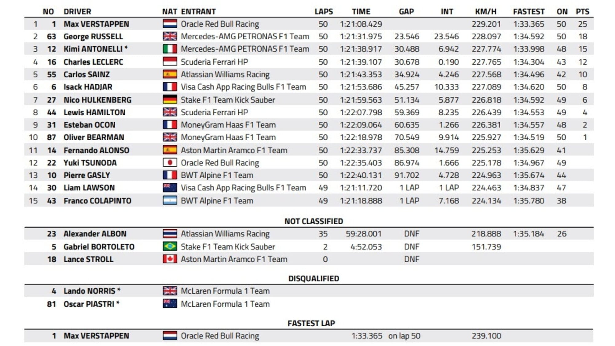 Gara generosa per Isack Hadjar (sesto) e Nico Hulkenberg (settimo) che regalano punti preziosi rispettivamente a Racing Bulls e Sauber, così come positiva è la gara della Haas, che conquista un doppio piazzamento a punti sia con Esteban Ocon (nono) che con Oliver Bearman (decimo).