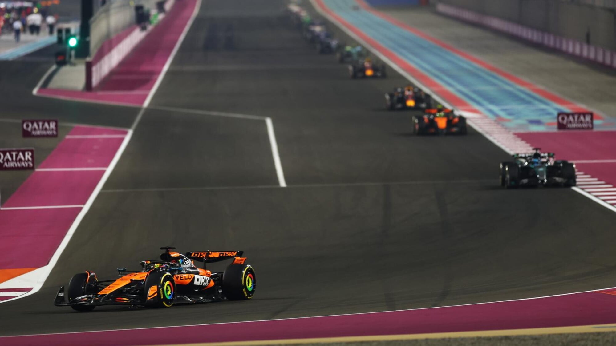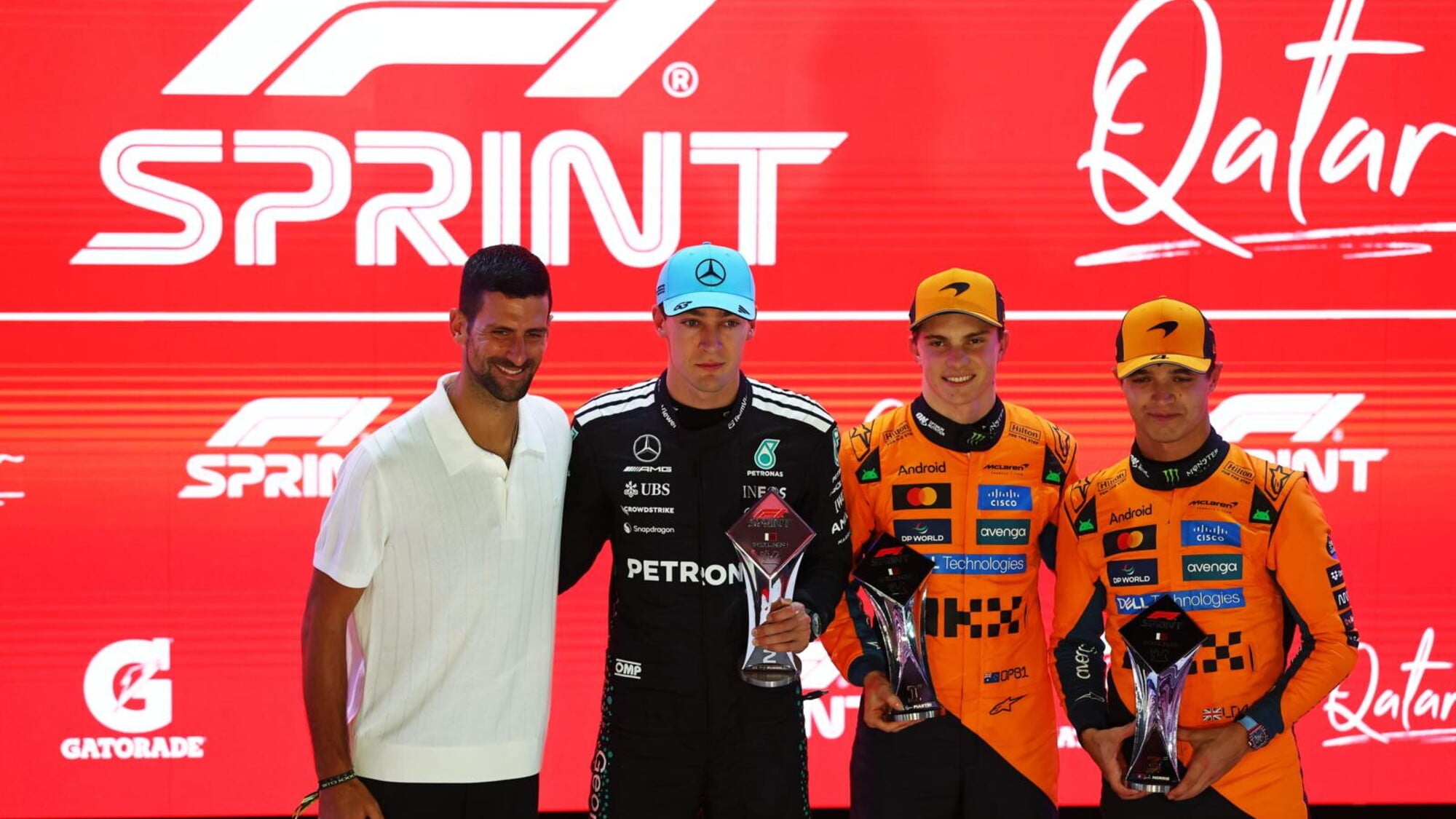 La griglia di partenza della Sprint del Gp del Qatar vede in prima fila Oscar Piastri (McLaren) autore del miglior tempo (1’20”055) davanti a George Russell (1’20”087), autore di un ottimo giro con la sua Mercedes W16 che lo ha portato a soli 32 millesimi dal miglior tempo, accumulando il gap solamente nelle ultime due curve. In seconda fila la McLaren di Lando Norris (1’20”285) davanti all’Aston Martin di un sorprendente Fernando Alonso (1’20”450), quarto. In terza fila troviamo le due Red Bull di Yuki Tsunoda (1’20”519) e di Max Verstappen (1’20”528) con il campione olandese che si è lamentato nel giro secco per l’eccessivo bouncing accusato dalla sua monoposto.