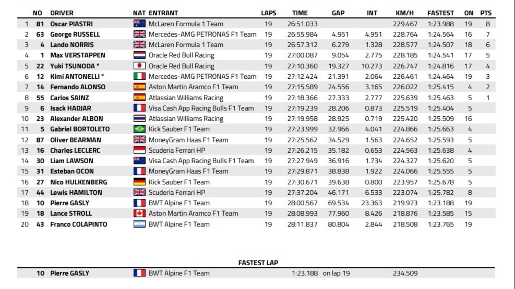 A dirla tutta, Antonelli sarebbe potuto salire al quinto posto per via dei cinque secondi di penalità inflitti a Tsunoda per il mancato rispetto dei track limits, ma nel finale di Sprint anche il giovane pilota bolognese ha commesso lo stesso errore (subendo anch’egli cinque secondi di penalità ), motivo per il quale la classifica finale resta immutata.