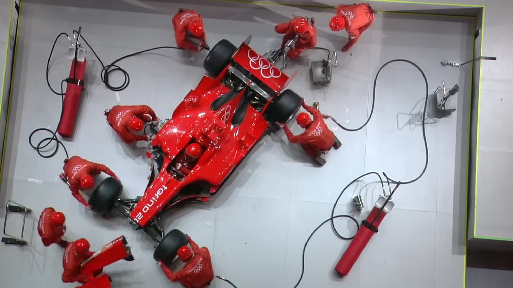 Tutto parte con un pitstop in cui i meccanici si avvicinano alla Rossa per montare il musetto, e per avvitare le gomme. In macchina, seduto al volante della monoposto troviamo il collaudatore Luca Badoer, il quale una volta completato il lavoro dei meccanici e dato il segnale di accensione della macchina (con conseguente abbassamento della pedana dove si trovano meccanici e macchina), non esita, al volante della F2005, a far sentire a pieno la potenza del V10 Ferrari entrando sul palco appositamente preparato ed effettuando alcuni burn-out, per poi disegnare con i donuts cinque cerchi, a raffigurare idealmente i cinque cerchi olimpici, con i fuochi d’artificio rossi in onore della scuderia di Maranello a chiudere questo momento così speciale.