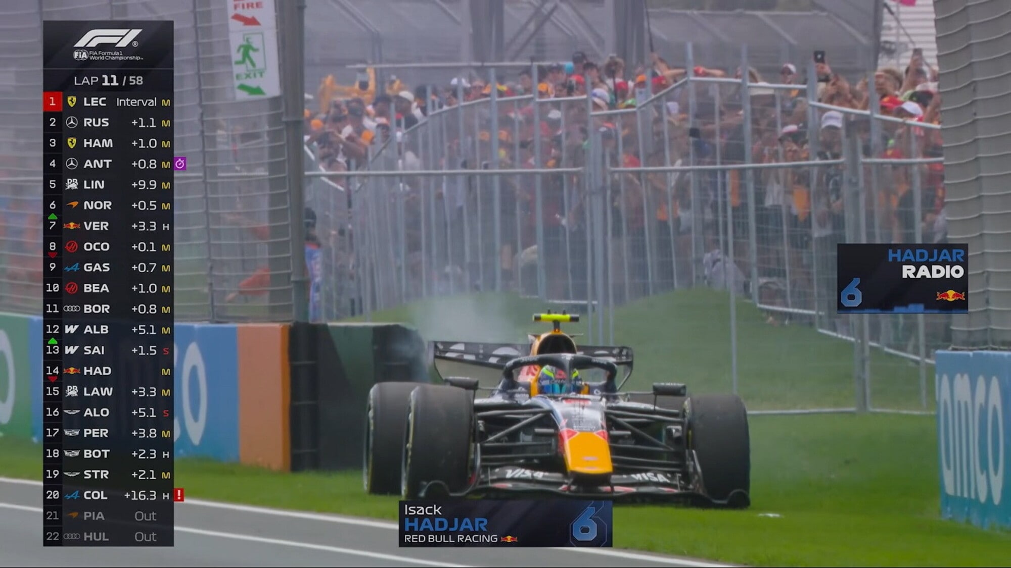 Al termine della gara, il pilota franco-algerino non ha nascosto la sua delusione, ammettendo che si sentiva in grado di poter lottare per il podio, che in partenza si sentiva molto forte, ma poi quasi subito ha cominciato a sentire uno strano rumore, e a quel punto ha capito che difficilmente avrebbe potuto concludere la gara. Cosa poi alla fine palesatatsi in pieno. Ciò nonostante lo stesso Hadjar si sente piuttosto fiducioso, consapevole del fatto di essere all’inizio del suo percorso in Red Bull e che imparerà anche da questa esperienza in Australia, guardando già con fiducia alla prossima gara di campionato in Cina.