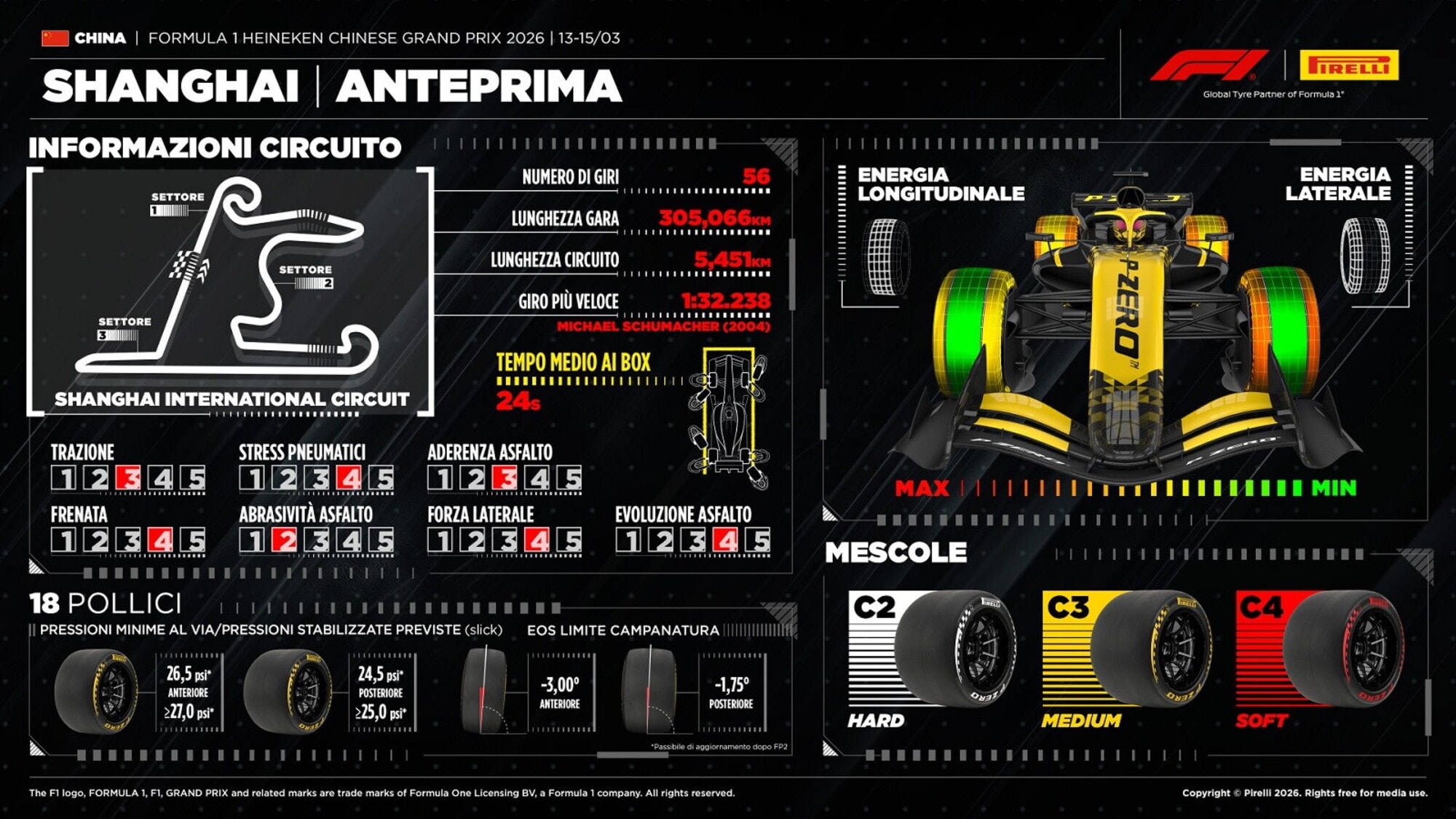 Per il Gp di Cina Pirelli conferma la scelta fatta a partire dal 2024 (anno che ha visto il ritorno del circuito di Shanghai nella massima serie motoristica), con le mescole selezionate che saranno C2, C3 e C4.