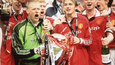 Già nella sua prima stagione in Inghilterra chiude 22 partite senza subire gol, trascinando lo United al titolo che mancava da ben 26 anni. Vincerà il campionato altre quattro volte, l'ultima nel 1999, stagione in cui i Red Devils completano il "Treble", conquistando tutte le competizioni. Su tutte, la Champions League, nell'assurda finale contro il Bayern Monaco al Camp Nou di Barcellona: le reti di Sheringham e Solskjaer dopo il novantesimo a ribaltare il vantaggio di Basler, con l'1-1 in cui lo stesso Schmeichel ricopre un ruolo non banale, visto che si lancia alla disperata a caccia del gol lui stesso, nell'area dei bavaresi. E dopo il 2-1, indimenticabile la capriola con cui il danese festeggia, a dimostrazione di un'agilità spesso sottovalutata.