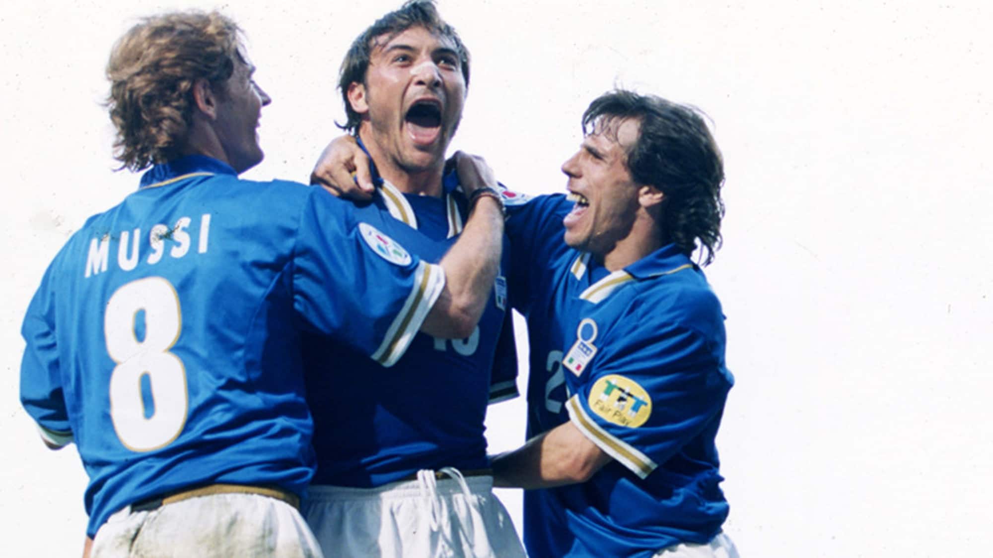 L’Inghilterra di Terry Venables, eliminata dalla Germania in semifinale dopo un rigore sbagliato da Gareth Southgate (attuale C.T. inglese), si schierava invece con un 3-5-2 più offensivo, con due centrocampisti d’attacco sulle fasce (Anderton a destra, McManaman a sinistra) e una mezzala di grande qualità come il “pazzo” Gascoigne in mezzo. Gli inglesi sono stati senza ombra di dubbio la squadra che ha schierato più qualità nel suo undici titolare. Infine la Francia di Aimé Jacquet, come detto, è l’unica squadra tra le prime quattro classificate ad aver utilizzato la difesa a quattro. Quello transalpino è un 4-3-1-2 abbastanza asimmetrico perché in realtà il trequartista Zidane parte sempre dalla sinistra per poi convergere al centro, affianco delle due punte Loko e Djorkaeff. Squadra abbastanza fumosa come da tradizione transalpina, la Francia ha mostrato una difesa di ferro con i vari Thuram e Blanc, ma poca concretezza nell’area di rigore avversaria, dove è mancato un grande terminale offensivo. È finita invece ai gironi l’avventura dell’Italia di Arrigo Sacchi, che neanche in Inghilterra ha derogato dal suo marchio di fabbrica (il 4-4-2) con Del Piero schierato esterno di centrocampo e Casiraghi e Zola di punta.