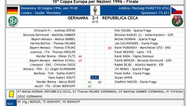 La Germania, vincitrice grazie al golden gol di Oliver Bierhoff contro la Cechia, rappresenta l’ultimo sussulto di gloria della “panzer generation”, ovvero del calcio teutonico tutto fisicità, corsa e muscoli, organizzato con marcature a uomo e libero staccato, in quell’edizione magistralmente interpretato da Matthias Sammer, poi vincitore del Pallone d’oro. La selezione di Berti Vogts gioca un calcio semplice e prosaico, ma tremendamente efficace: la squadra si affida soprattutto alle sventagliate di Sammer sulle due fasce dove i due esterni a tutta fascia Strunz e Ziege macinano chilometri su chilometri. In mezzo al campo Scholl e Haessler sono gli unici due elementi dotati di fosforo, mentre l’attacco prevede giocatori di fisico e potenza abili nel gioco aereo (Kuntz, Klinsmann e la riserva di lusso Bierhoff). La Repubblica Ceca di Dušan Uhrin, nazionale che nella sua epoca d’oro ha sempre giocato in modo offensivo, si schiera invece con una sorta di 3-4-2-1 ancora più conservativo di quello tedesco, con una sola punta (Kuka) sostenuta da due mezzali abili negli inserimenti (Berger e Poborský).