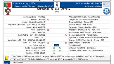 L’Europeo di Portogallo 2004, che avrebbe dovuto passare alla storia come il primo trofeo internazionale vinto dalla squadra lusitana, è passato invece alla storia come quello che ha mostrato al calcio europeo una delle più grandi sorprese calcistiche avvenute nel Vecchio Continente. Infatti, la Grecia di Otto Rehhagel si laurea campione d’Europa tra lo stupore generale, ma in maniera assolutamente meritata e legittima perché gli ellenici battono due volte i padroni di casa del Portogallo (nel match d’esordio e in finalissima) ed eliminano Francia e Repubblica Ceca ai quarti e in semifinale, sempre di misura (1-0), ma senza mai ricorrere ai calci di rigore.