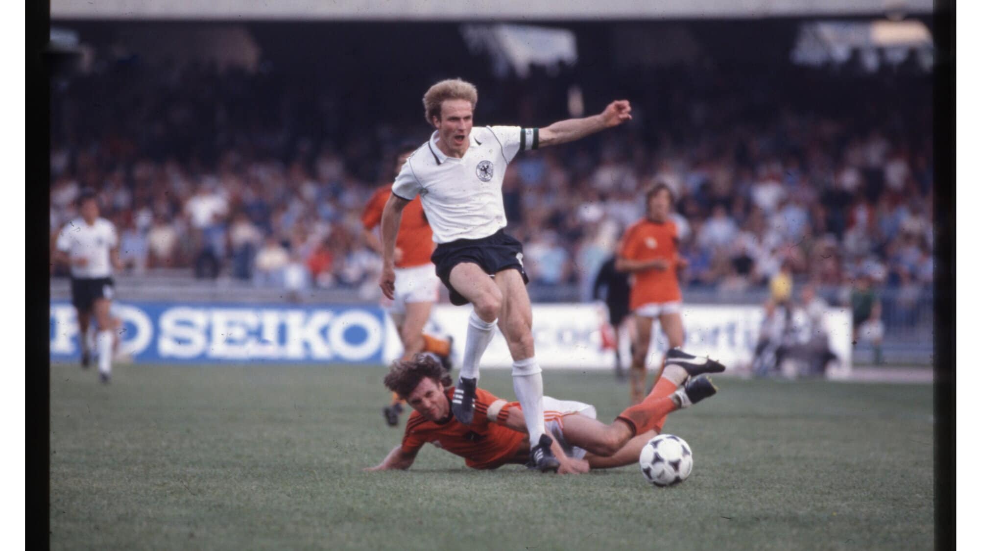 Arrivò, così, anche la chiamata in Nazionale, nella quale l’esordio avvenne in un’amichevole vittoriosa (2-0) giocata a Cardiff contro il Galles il 6 ottobre 1976. Fu l’apertura di un capitolo importante nella carriera di Rummenigge che lo portò ad affermarsi a livello globale già in Argentina nel 1978, dove realizzò una doppietta nella goleada contro il Messico (6-0) e una rete nella sconfitta patita contro l’Austria (2-3), che impedì ai tedeschi l’accesso alla finale per il terzo posto. Gol che arrivarono dopo il primo in assoluto che Kalle segnò proprio all’Italia in un’amichevole giocata a Berlino l’8 ottobre 1977, vinta 2-1 dalla Germania Ovest. Una nazione che, in futuro, regalerà soddisfazioni (con l’Inter) e dolori. Fu la nostra Nazionale, infatti, a negare all’attaccante tedesco il titolo di campione del mondo l’11 luglio 1982. Uno smacco che, nella sua consueta signorilità, Rummenigge riconoscerà come meritato. Ma fu comunque in Italia che Karl Heinz raccolse il suo unico trionfo con la Mannschaft, agli Europei del 1980, quando il cielo di Roma fece da cornice al suo sorriso dopo la vittoria della finale contro il Belgio. Probabilmente, fu proprio in quegli anni di passaggio tra un decennio e l’altro che Kalle raggiunse l’apice del rendimento, arrivando secondo nella classifica del Pallone d’Oro nel 1979 e vincendolo nei due anni successivi insieme alla Bundesliga e al titolo di capocannoniere del campionato.